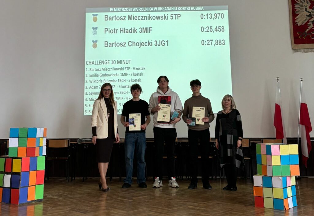 18 marca 2026 r. w auli szkolnej odbył się konkurs układania kostki Rubika, w którym udział wzięli uczniowie pasjonujący się speedcubingiem. Zawody rozegrano w dwóch kategoriach: 3×3 oraz challenge. W konkurencji 3×3 o końcowym wyniku decydowała średnia z 5 ułożeń, Czytaj dalej …